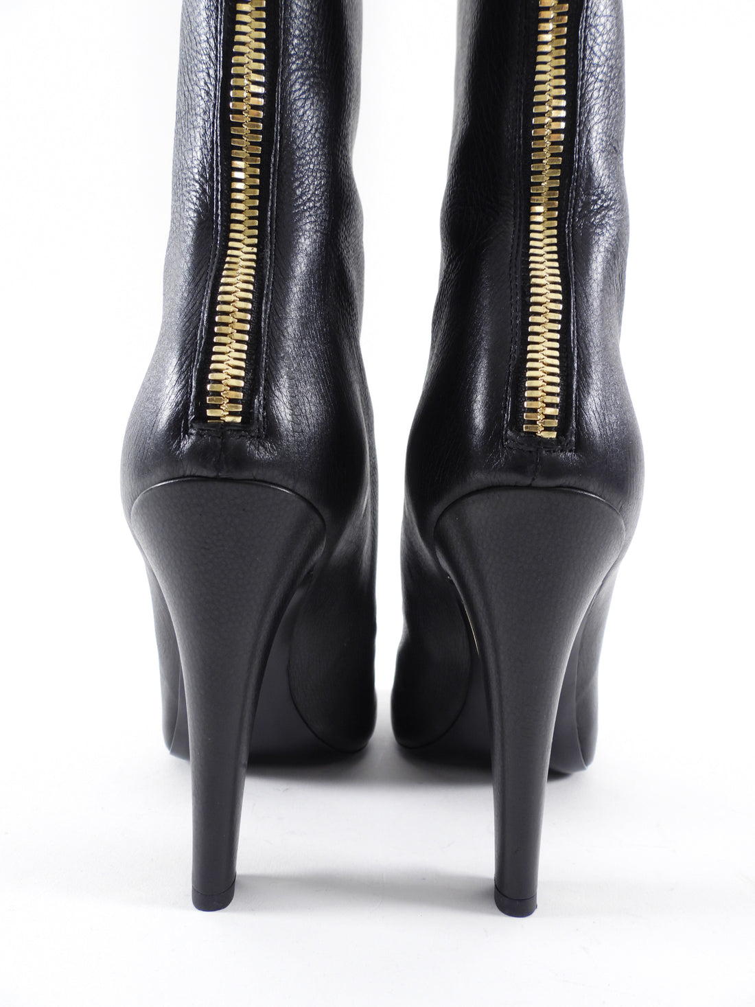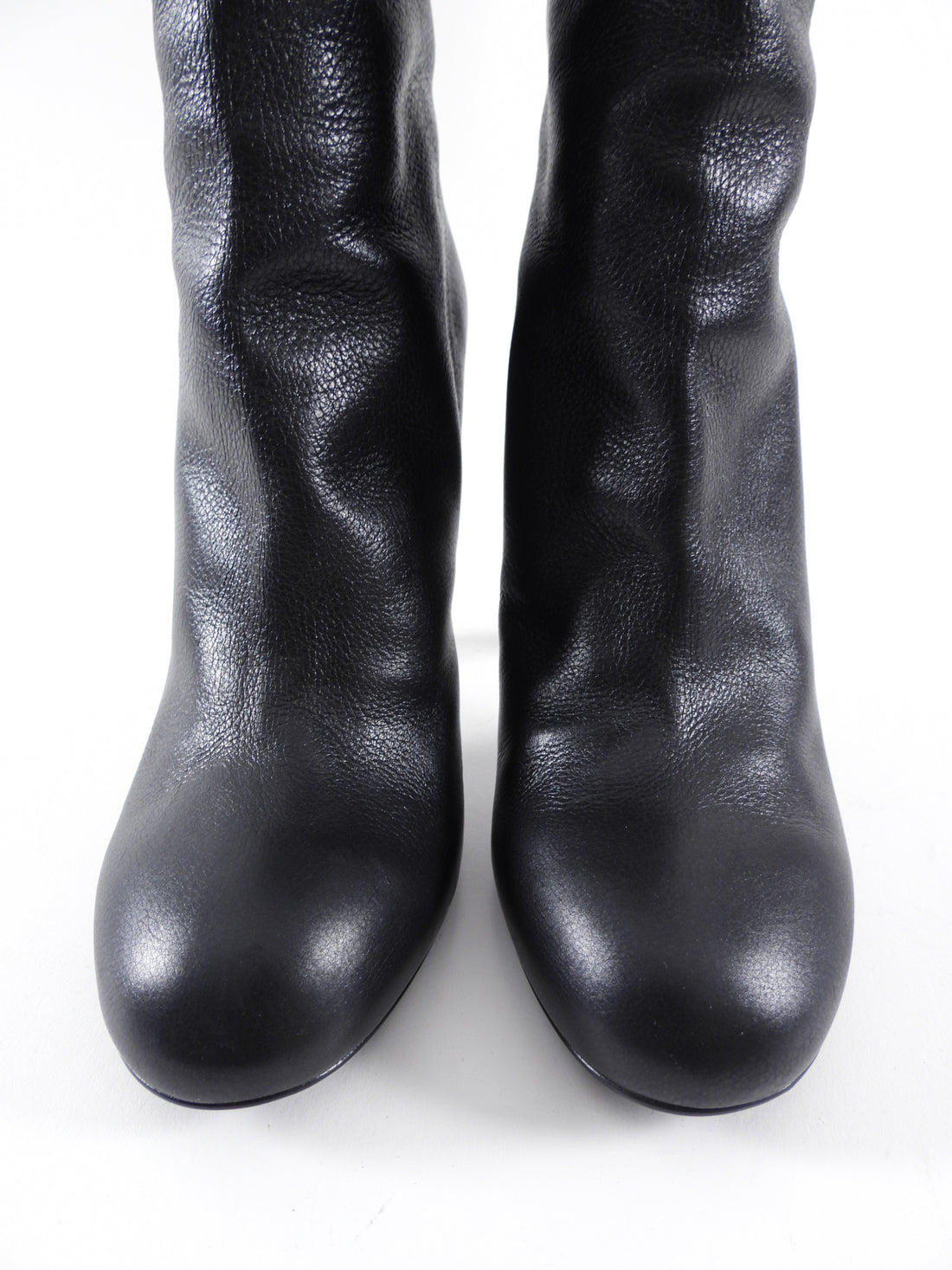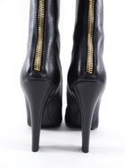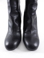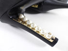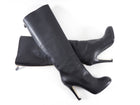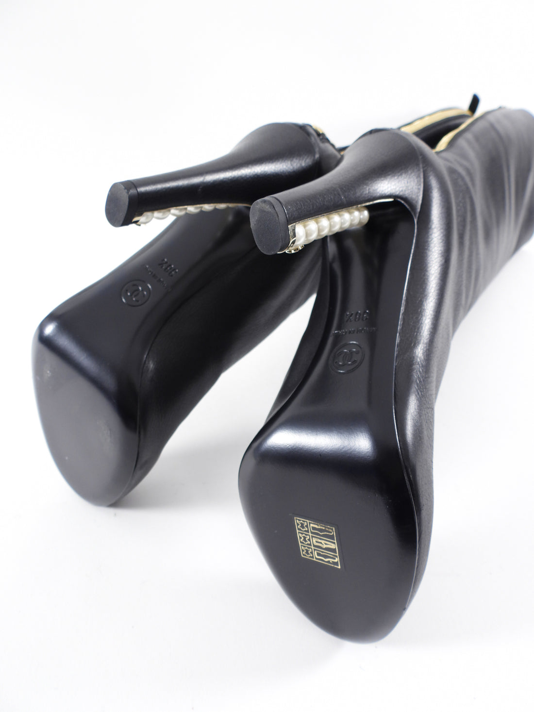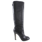 Chanel 2013 Pearl Heel Tall Zip Back Black Leather Boot. Black leather tall boot, goldtone exposed back zipper, pearl detail 110mm high heels.