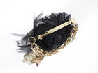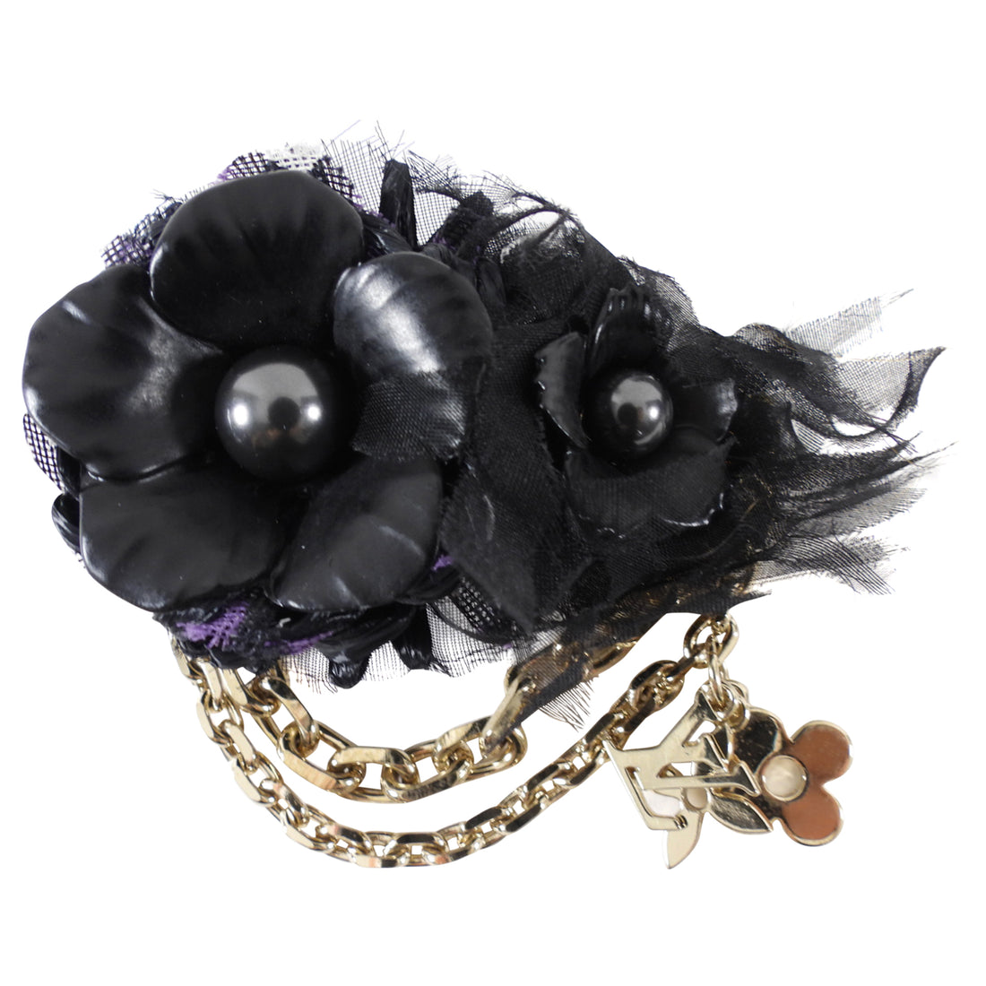 Louis Vuitton Vintage Black and Purple Flower Brooch. from the fall 2005 collection by Marc Jacobs. Black and purple fabric and faux pearl, shiny goldtone metal chain and LV charms detail.
