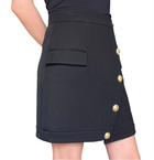 Balmain Black Gold Button Mini Skirt. Black wool mini skirt with diagonal signature Balmain gold buttons at front. Gold exposed zip closure at rear. 100% Wool.