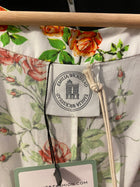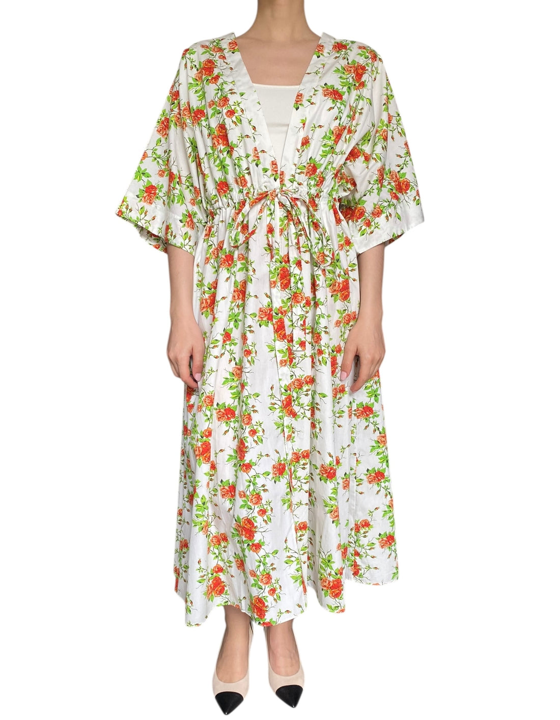 Emilia Wickstead Orange Floral Zarina Long Kaftan Dress. White maxi length kaftan dress with orange floral print throughout. Belted at waist and deep V neckline. 100% Cotton. Marked size L. Would fit US 8-12.