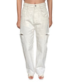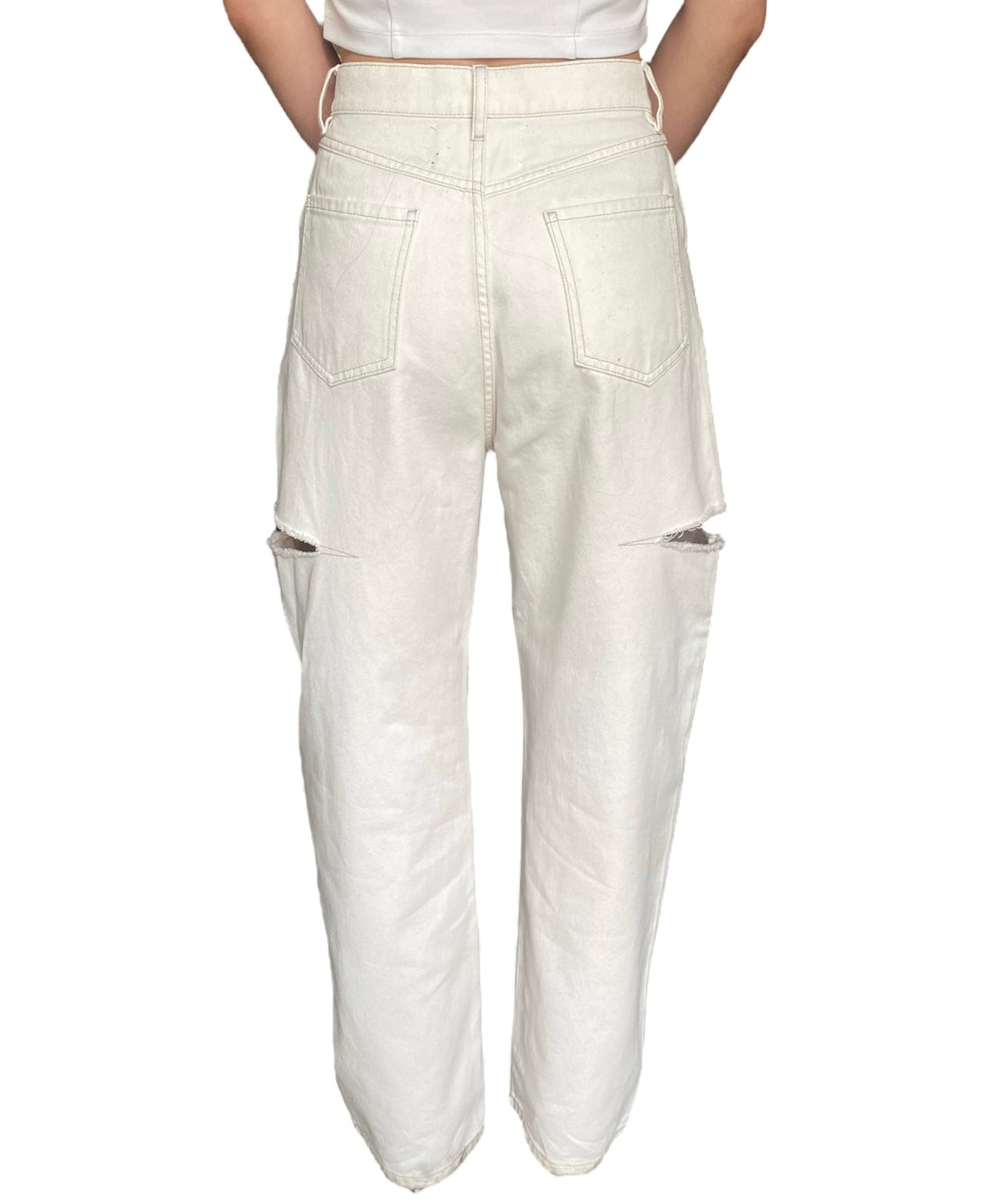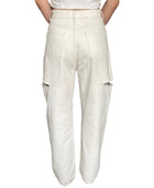 Margiela White Slashed Wide Leg Denim. White loose fit jeans with slashes at side of legs. Wide leg and high waisted design. Zipper closure. Marked size 40 / US 6. 100% Cotton. Original retail: $725 CAD. 100% Cotton.