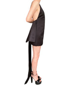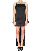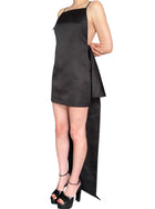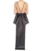 Prada Black Silk Train Bow Gown. Black high-low design silk gown with elegant square neckline. Backless with cross straps and bow train at back. Concealed side zip closure. Original retail price: $7,000. 100% Silk. Marked size 38 fits sizes US 4-6.