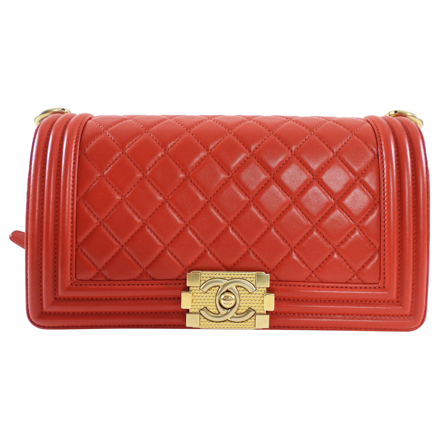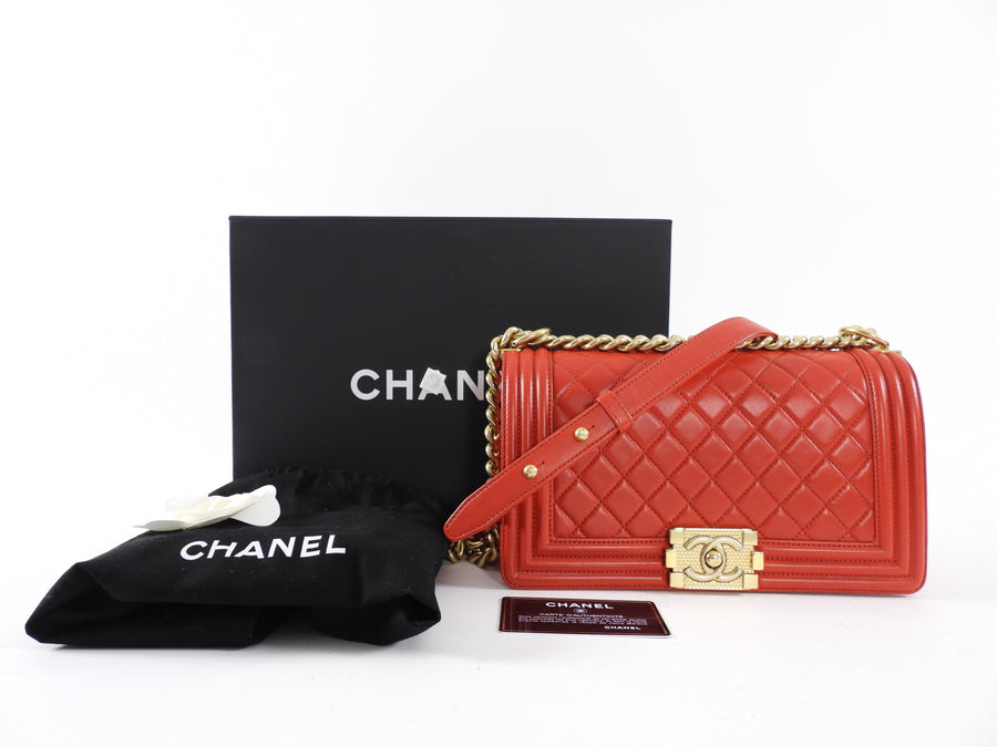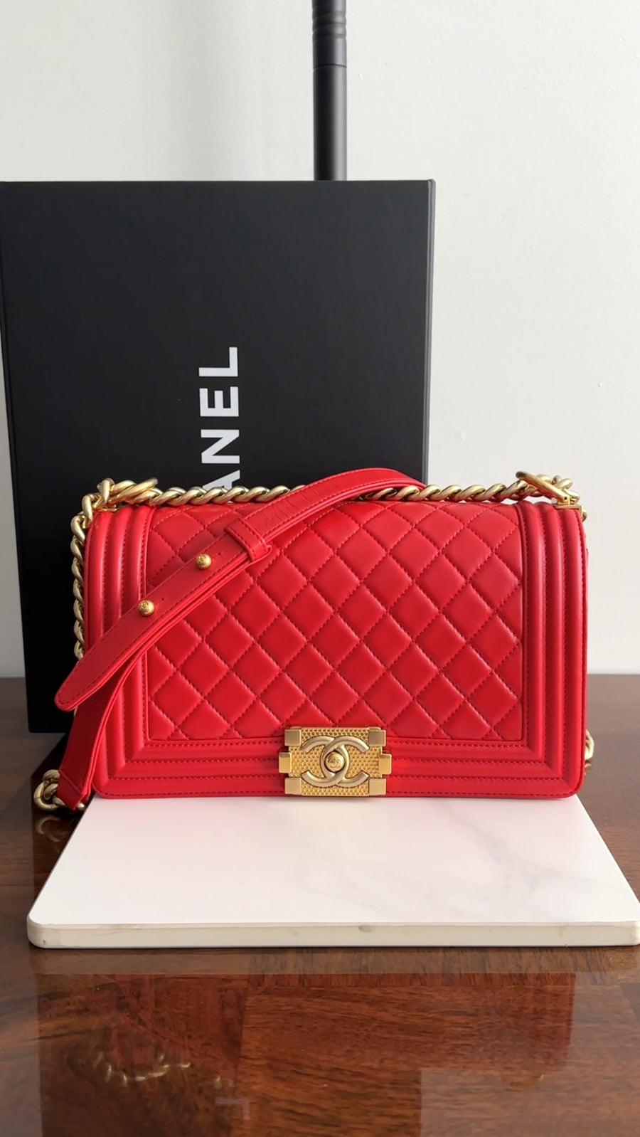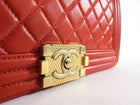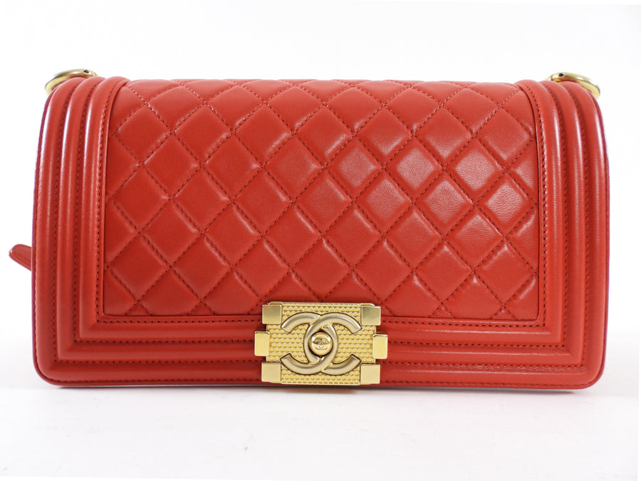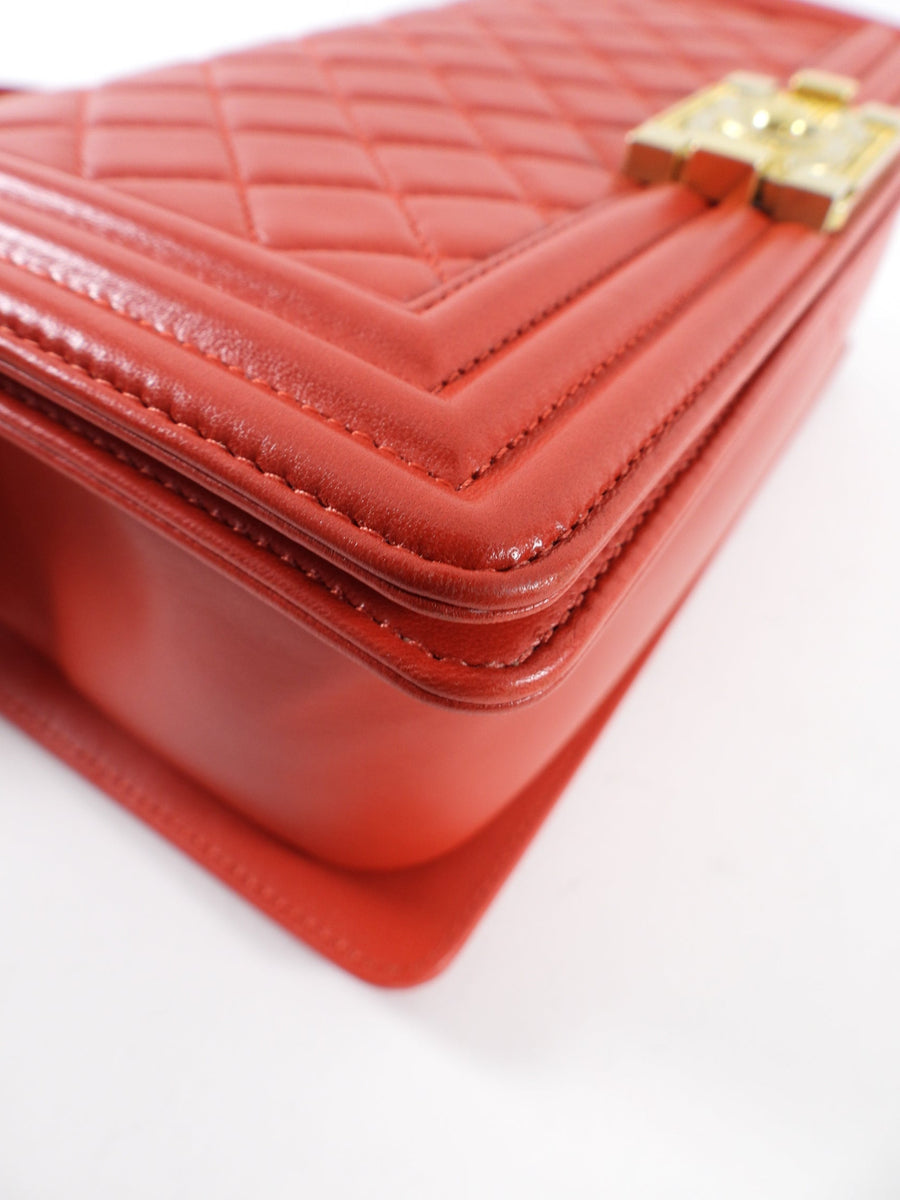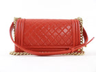 Chanel Red Quilted Lambskin Leather Medium Le Boy Bag GHW. Soft red quilted lather bag with matte goldtone hardware, CC push clasp, slide chain, fabric lined.