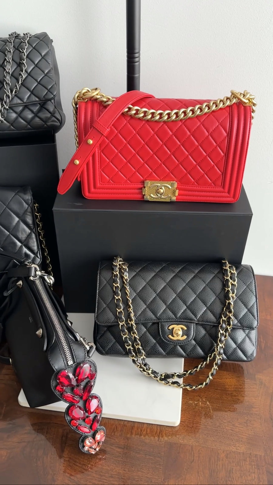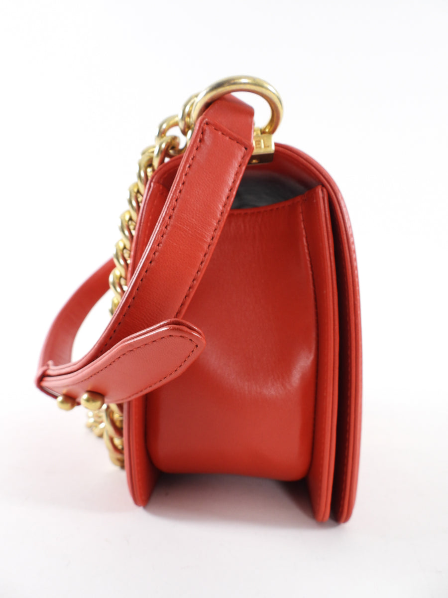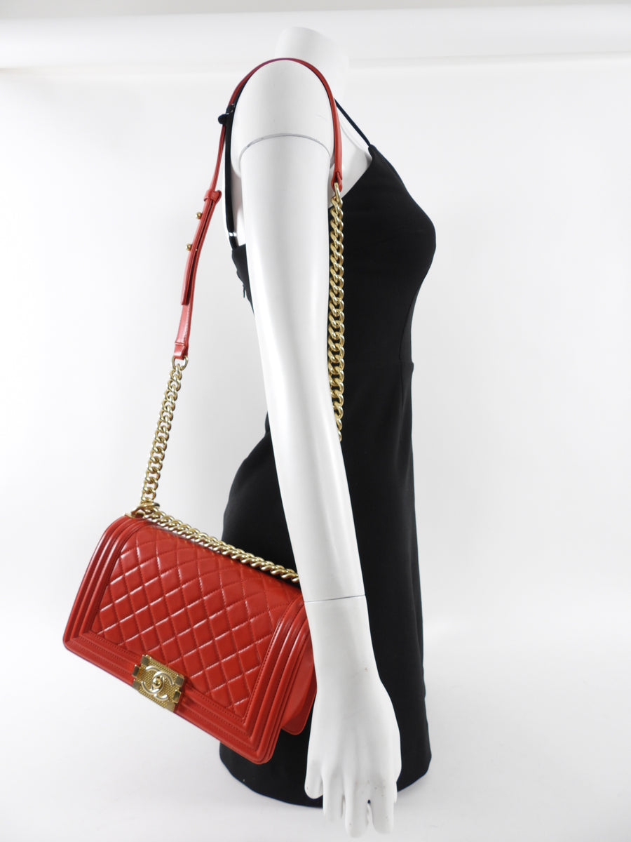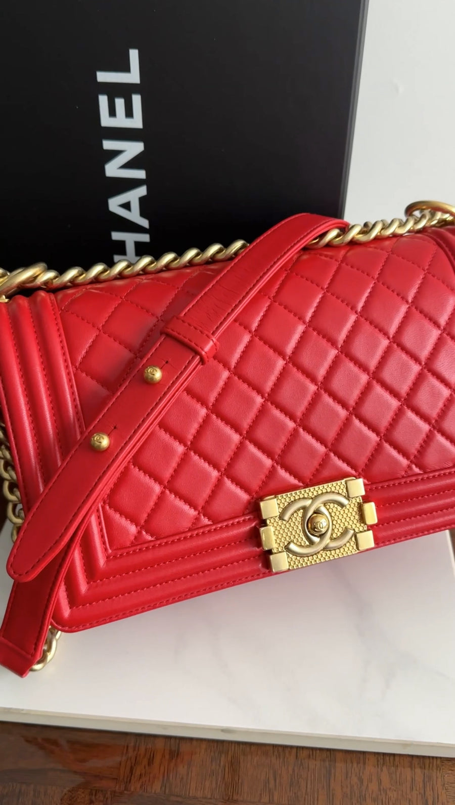 Chanel Red Quilted Lambskin Leather Medium Le Boy Bag GHW. Soft red quilted lather bag with matte goldtone hardware, CC push clasp, slide chain, fabric lined.