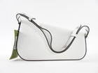 White leather, structured bag, slide tongue closure, silvertone hardware, canvas lined.