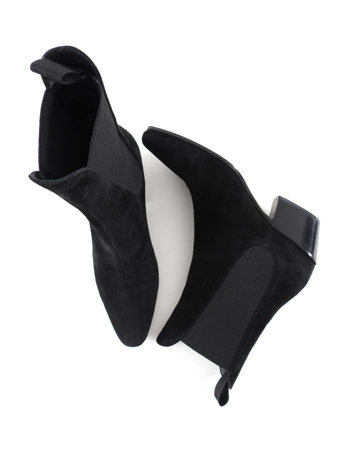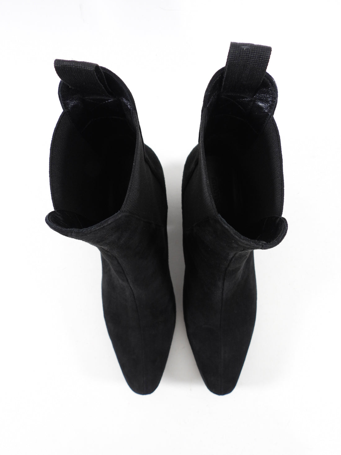 Khaite Black Suede Saratoga Ankle Boot. Black suede upper, 45mm heel, pull-on design with stretch elastic sides.