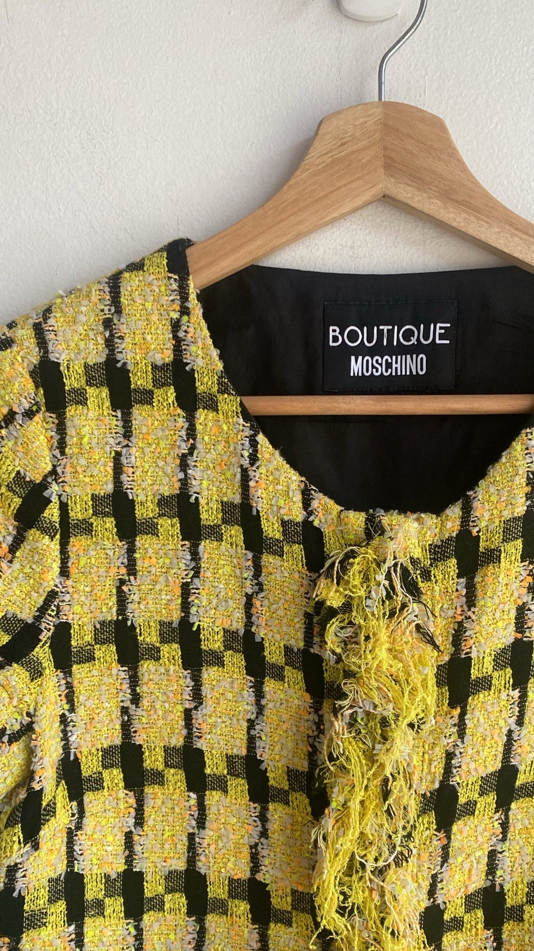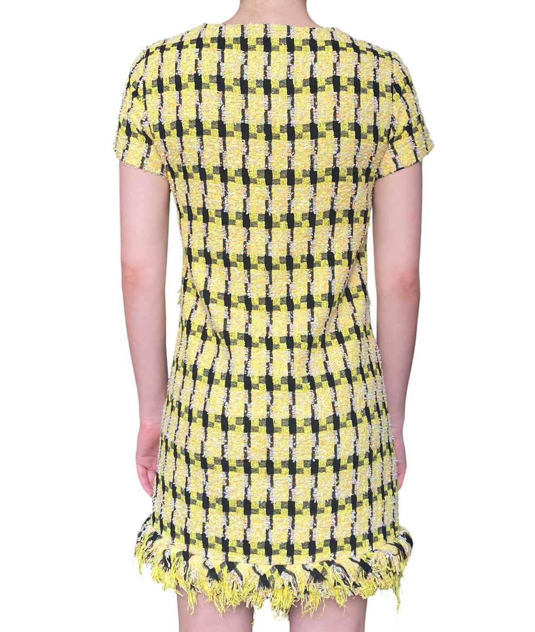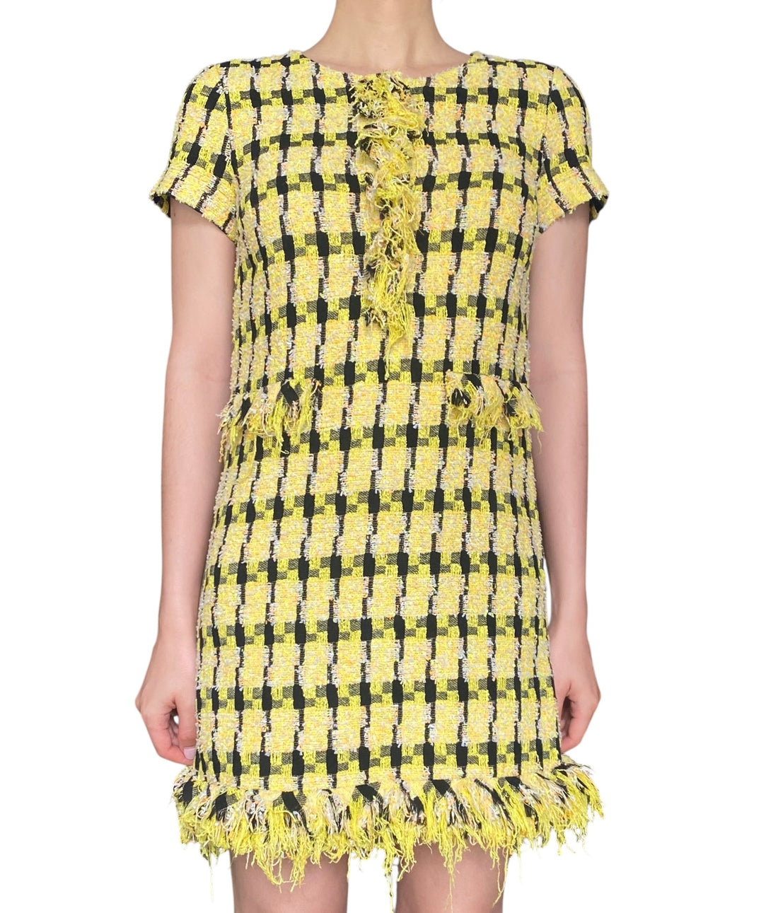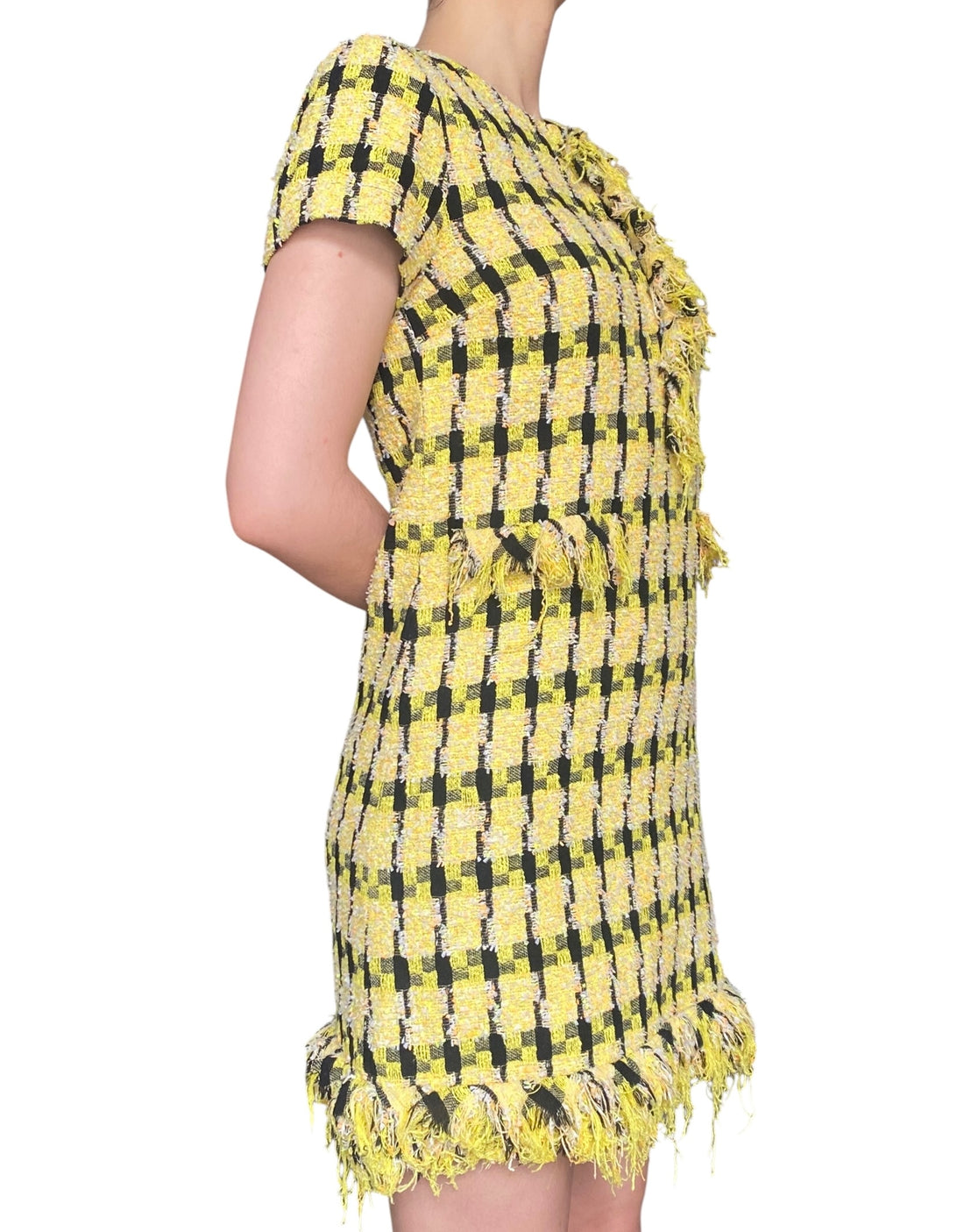 Moschino Yellow Tweed Fringe Trim Dress. Vivacious yellow tweed shift dress with cap sleeves and faux-flap pockets. Fringe trim at neck and hem. Size US 6.