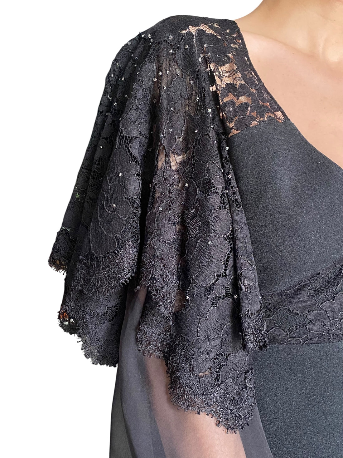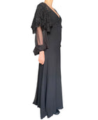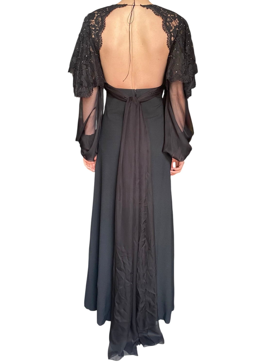 Saint Laurent Black Sequin Lace Evening Gown. Black floor length evening gown with sequin lace puff sleeves and chiffon belt/ train. Semi sheer sleeves with leather cuffs. Rear zip and hook closure. Marked Size FR 34 or US 2. 57% Acetate, 43% Viscose.